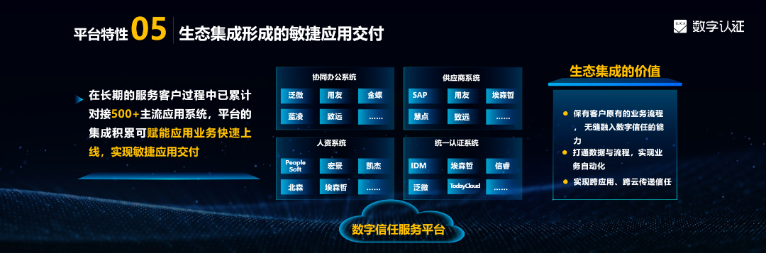 在长期服务客户的过程中,数字认证累计对接了500+主流应用系统,如此庞大的平台集成积累,可以帮助用户应用业务快速上线,实现敏捷应用交付。对客户而言,数字认证提供的生态集成,不仅能让客户保有原有的业务流程,具备无缝融入数字信任的能力,还能打通数据与流程,实现业务自动化,更是让跨应用、跨云传递信任照进现实。