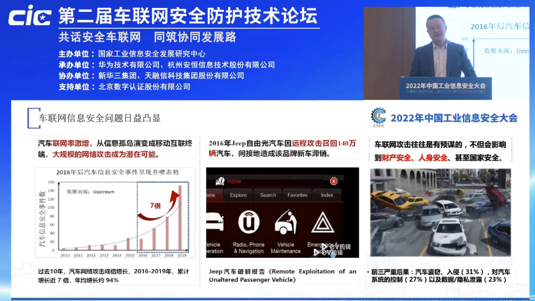 1月10日,由国家工业信息安全发展研究中心、工业信息安全产业发展联盟主办的中国工业信息安全大会在京隆重召开。作为国内举办最早、会议规格最高、规模最大的工业信息安全领域盛会之一,本届大会汇聚了最新技术研究成果和应用实践,助力全面推进落实国家工业信息安全发展重点任务。数字认证受邀参会,入选首批“久安计划”合作伙伴并荣获优秀应用案例奖。数字认证公司战略业务创新中心总监王新华于会上分享了“智能汽车网络安全与数据安全思考与实践”的主题演讲。
