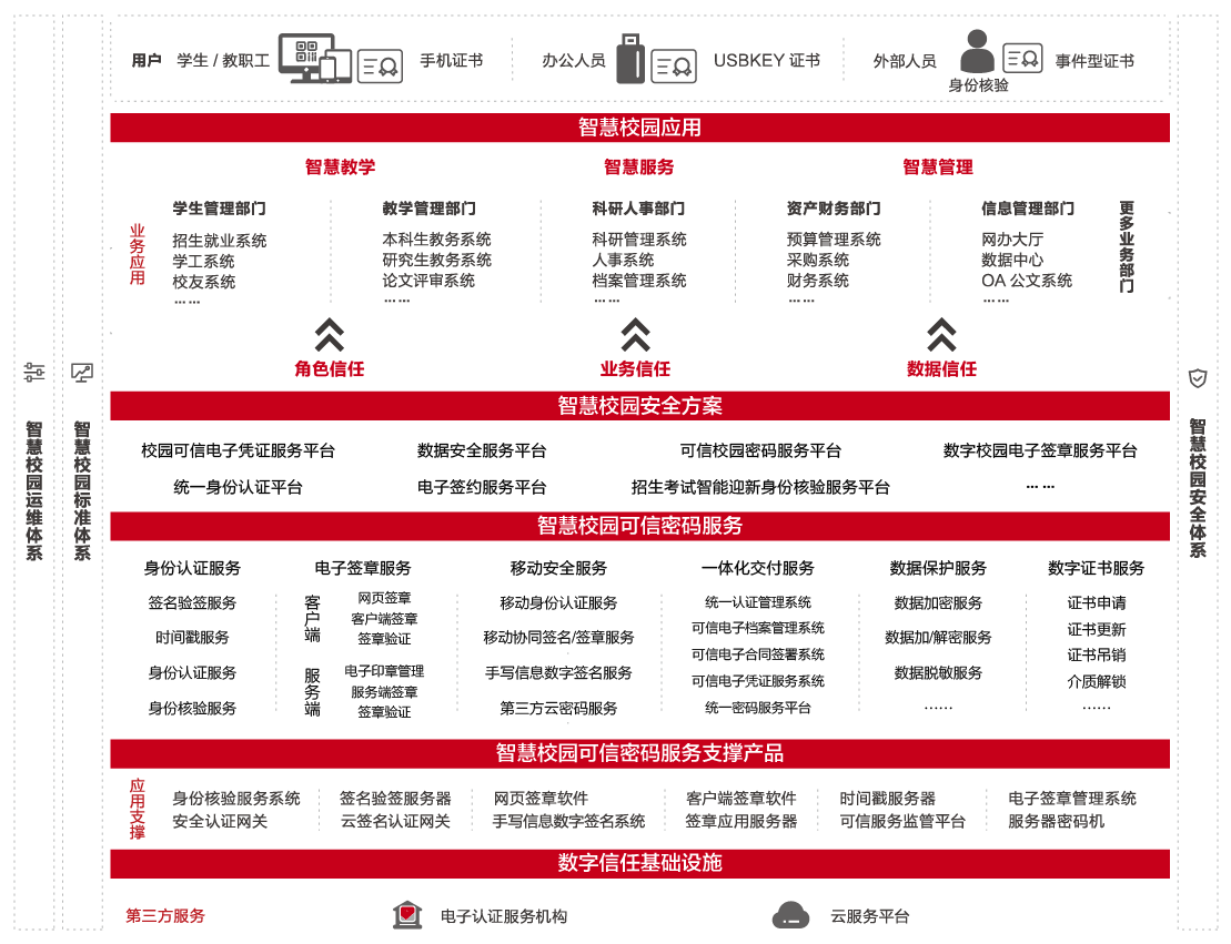 在智慧校园的总体框架中,建设虚实融合的混合式智慧教学方式、多用户多场景的智慧校园服务、内外一体联动的智慧管理的新一代校园应用创新体系,和以教育大数据驱动教育治理的新一代校园数字能力底座被列为核心任务。安全、牢固的数字基建设施将是构建智慧校园的关键。因此,建立以密码技术为底座的信息安全体系,成为智慧校园建设的重要任务。