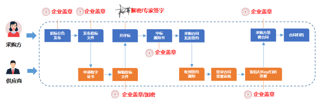 招投标全流程电子化的内涵,不只包含了大家熟知的招标、投标、开标、评标、定标环节,还有合同签订与文件归档等环节。这其中,密码技术在保障全流程身份真实性,数据完整性与机密性,行为抗抵赖方面发挥了重要作用,是实现全流程招投标电子化的驱动引擎。