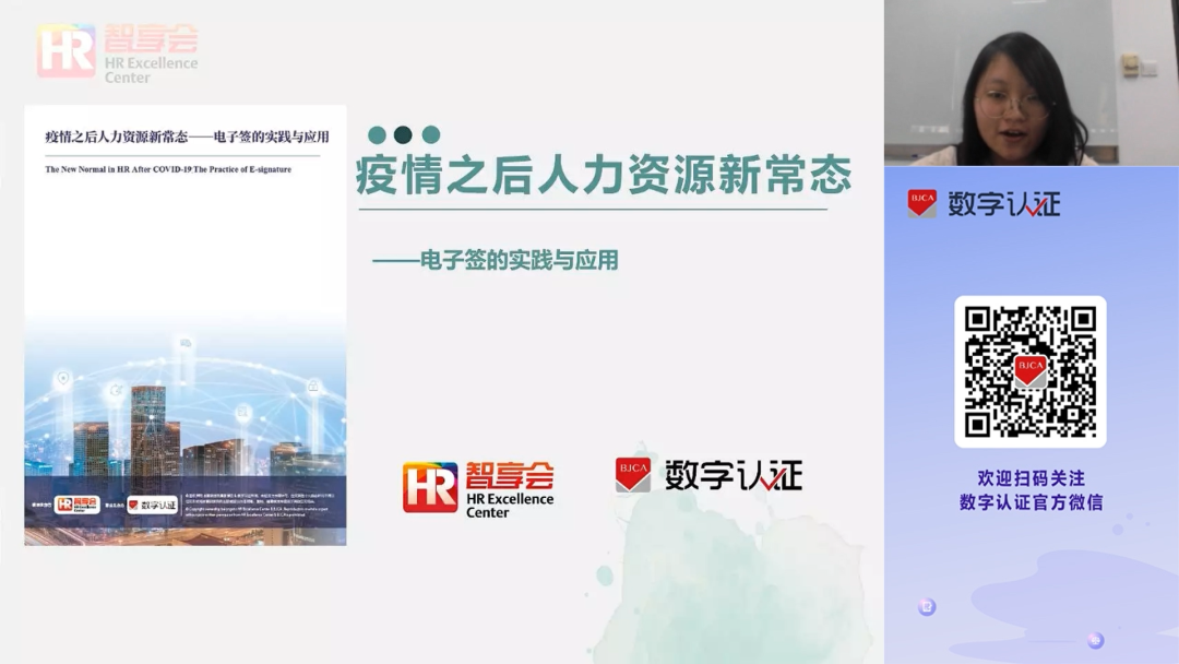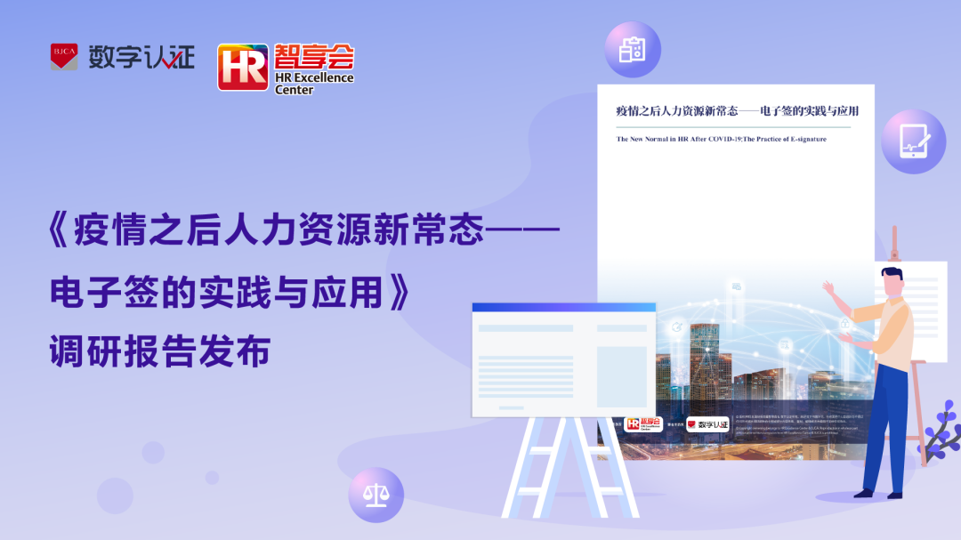 12月16日,北京数字认证股份有限公司(简称:数字认证)联合人力资源智享会HREC(简称:智享会)共同举办线上发布会,正式发布了《疫情之后人力资源新常态——电子签的实践与应用》调研报告。此报告是智享会联合数字认证历时8个月,调研200余家企业,深度访谈近20家行业知名企业人力资源负责人,共同撰写而成。