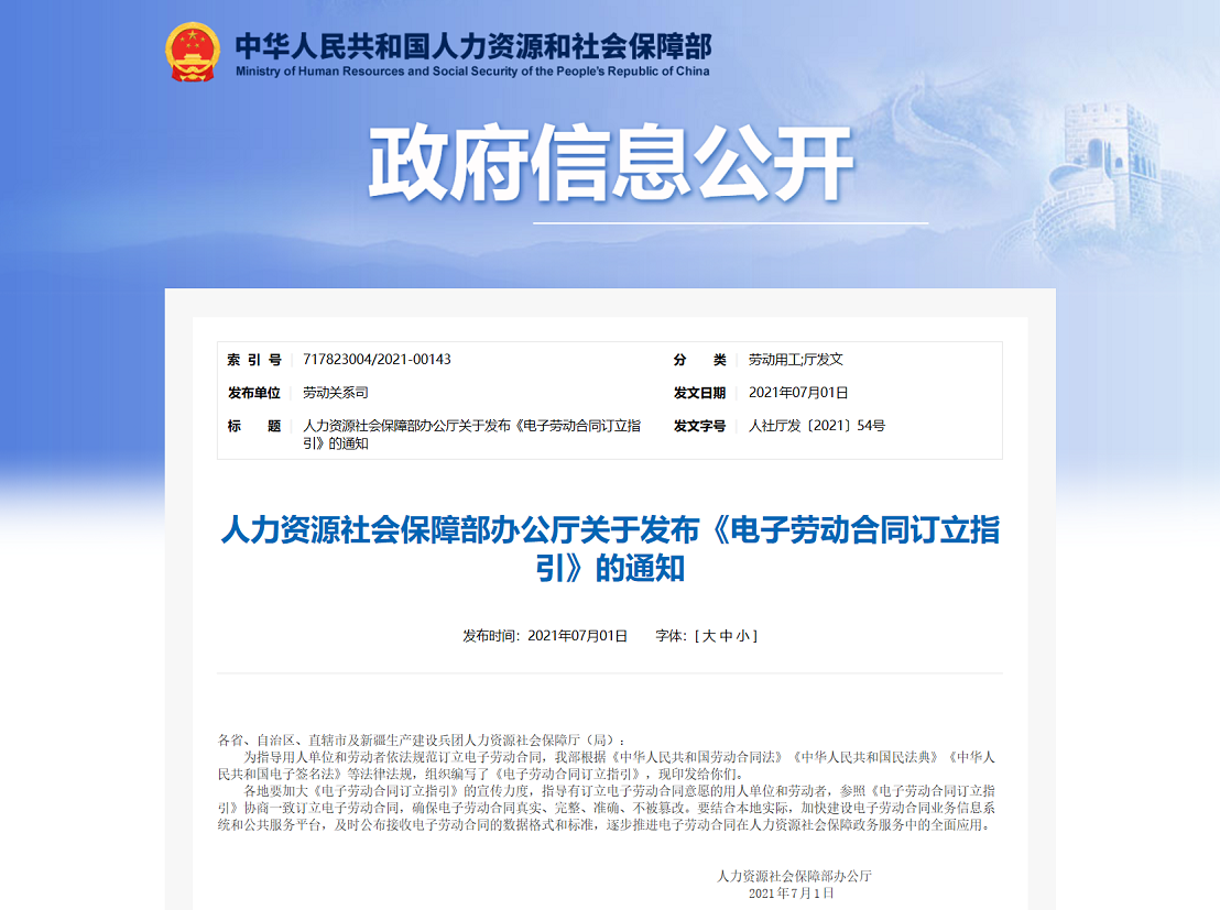 无独有偶。其实早在2020年3月,人力资源社会保障部办公厅就发布了《人力资源社会保障部办公厅关于订立电子劳动合同有关问题的函》(人社厅函〔2020〕33号),其中明确:“用人单位与劳动者协商一致,可以采用电子形式订立书面劳动合同。”